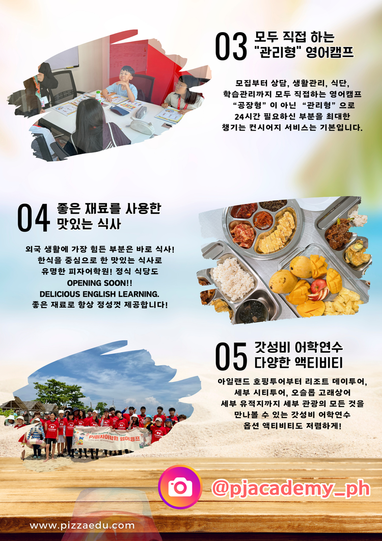 - 출국 2주전부터 출국일 기간에 취소 시, 계약금 및 캠프 정가 비용의 50%를 제외한 비용이 환불됩니다.